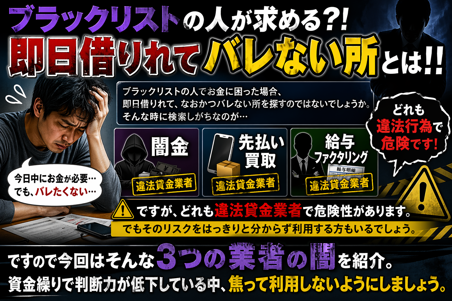 ブラックリストの人でお金に困ってしまった場合、即日借りれて、なおバレない所を探すのではないでしょうか。そんな時に検索しがちなのが「闇金」「先払い買取」「給与ファクタリング」などになってくるでしょう。ですがどれも違法貸金業者で危険性があります。でもそのリスクをはっきりと分からず利用する方もいるでしょう。ですので今回はそんな3つの業者の闇を紹介。資金繰りで判断力が低下している中、焦って利用しないようにしましょう。