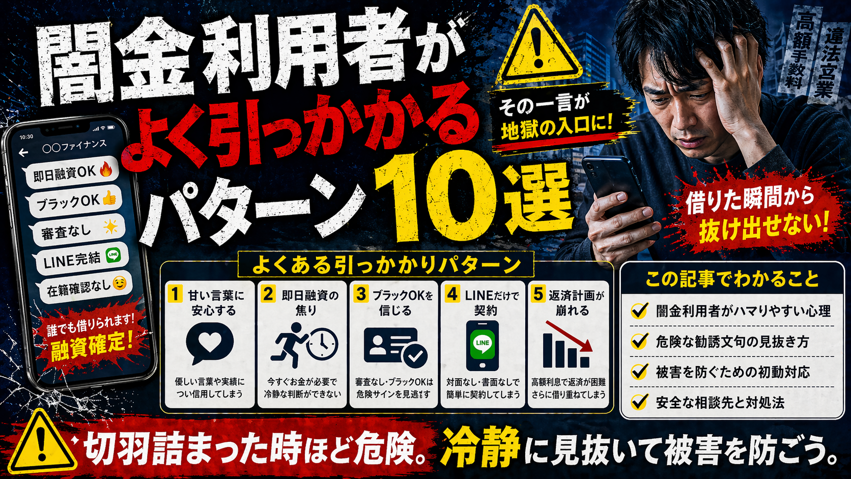 今回の記事では闇金利用者がよく引っかかるパターンを解説します。闇金利用者の中では「こんなはずじゃなかった」「返済計画を立てていたのに、なんでこんな事になったんだろう」と後悔する方は多いのではないでしょうか。実際、闇金を利用する方の多くは切羽詰まった状態で借り入れをするケースがほとんどでしょう。そんな時、どんな精神状態なのか。判断力低下や闇金に対する危機感の低下です。通常の状態であれば、闇金の危険さや借りたら返せなくなることなんてわかっています。ですがどうしてもお金が必要になったとき、闇金の文言に引っ掛かりやすくなります。そこで今回は闇金が利用者をひっかけるパターンを紹介。かなり重要な内容になりますので是非参考にしてください。